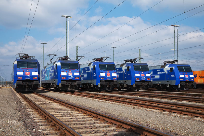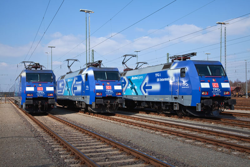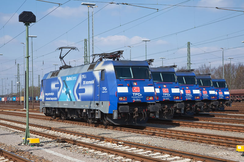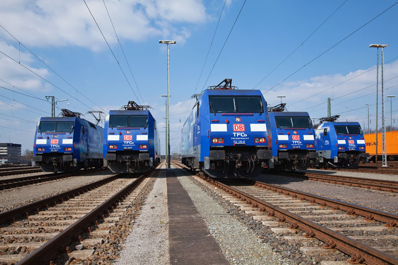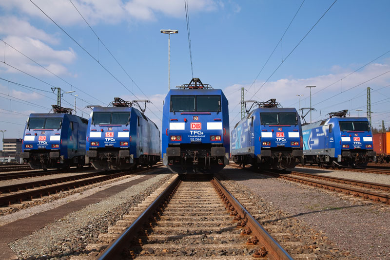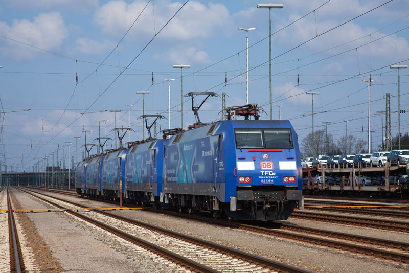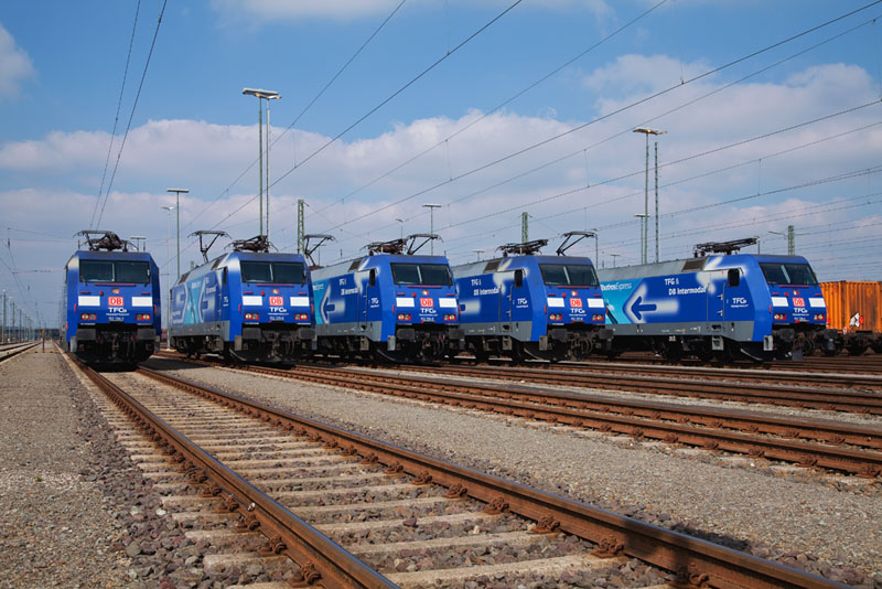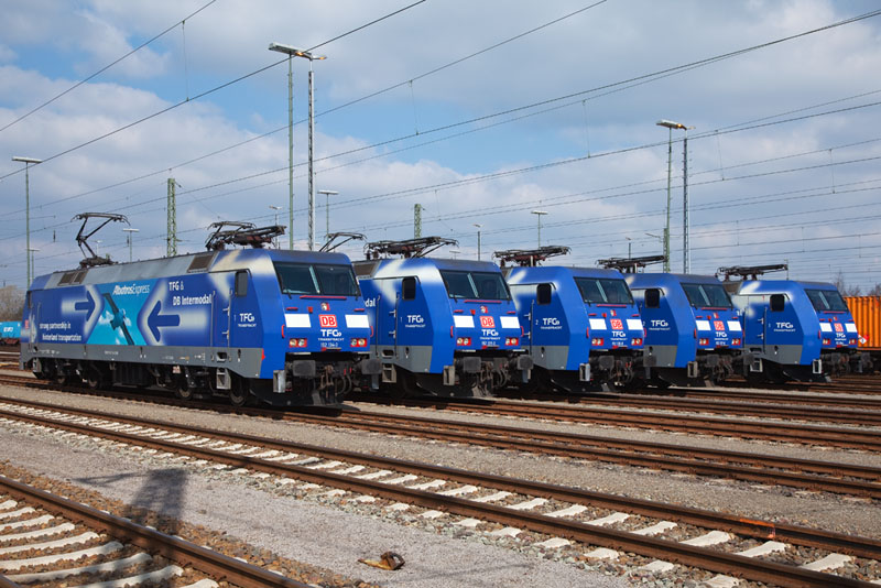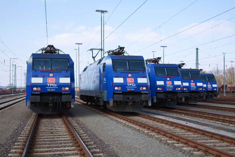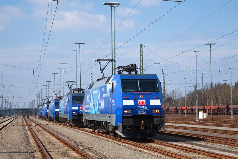| Die TFG Transfracht Werbeloks 152 134 - 152 138 "AlbatrosExpress" nehmen Stellung. Rangierbahnhof Maschen, 6. April 2012 |