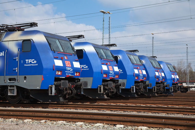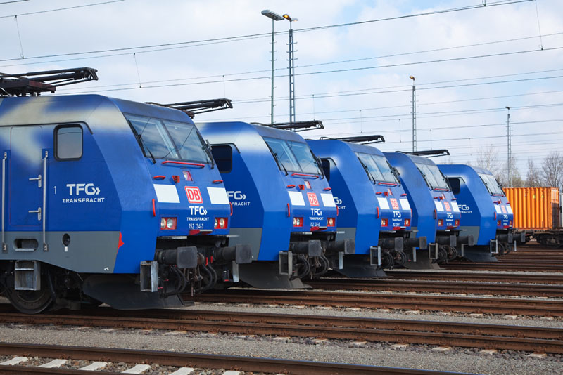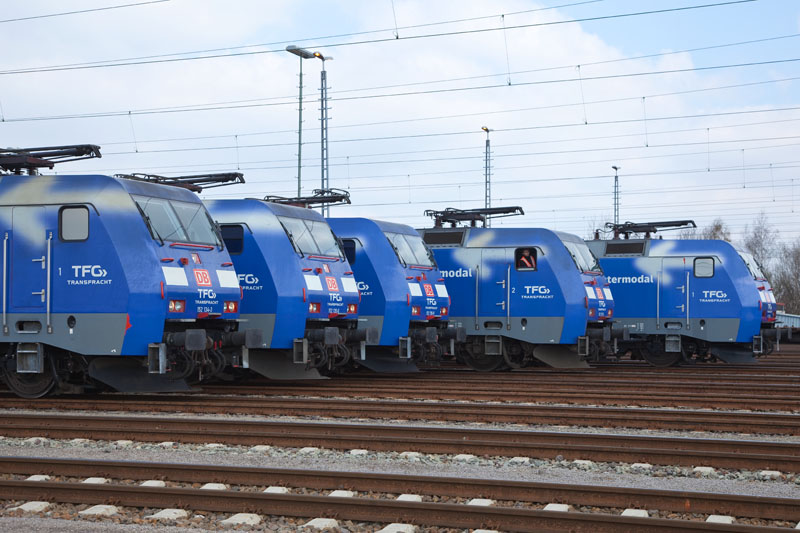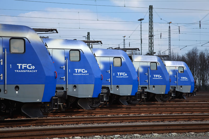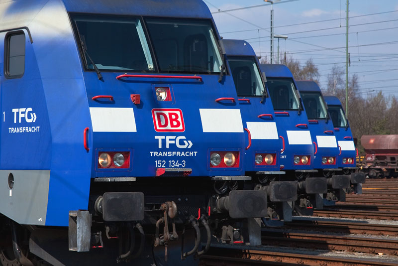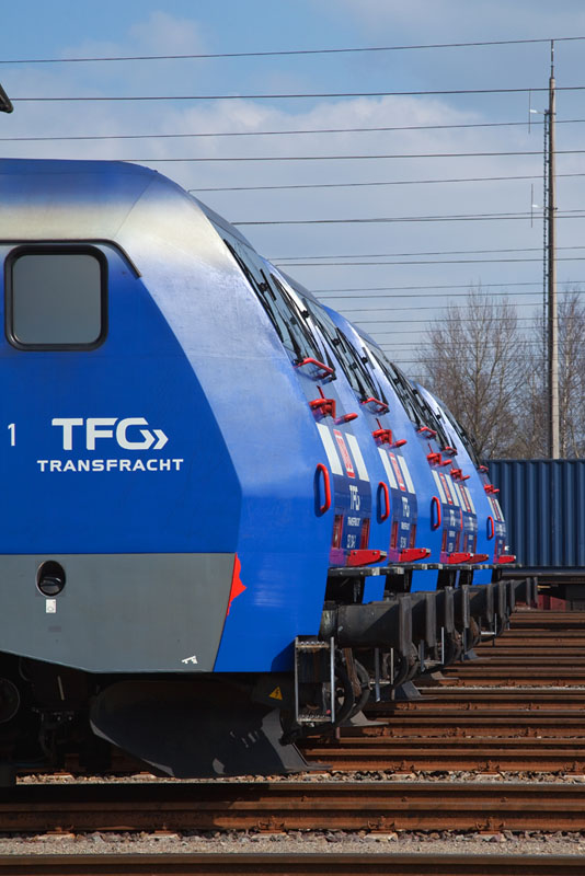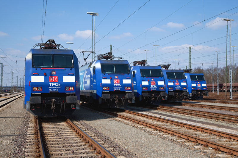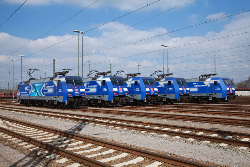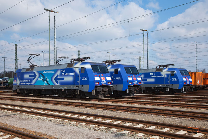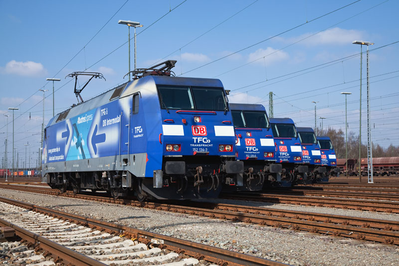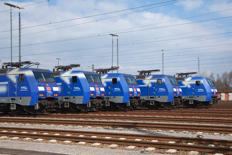 | Die TFG Transfracht Werbeloks 152 134 - 152 138 "AlbatrosExpress" nehmen Stellung. Rangierbahnhof Maschen, 6. April 2012 |