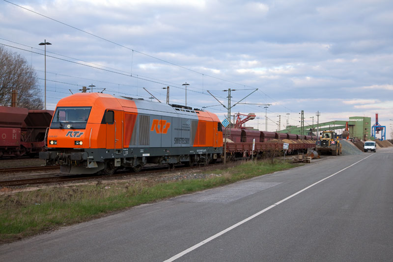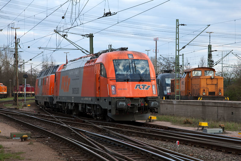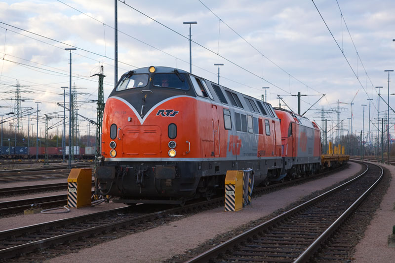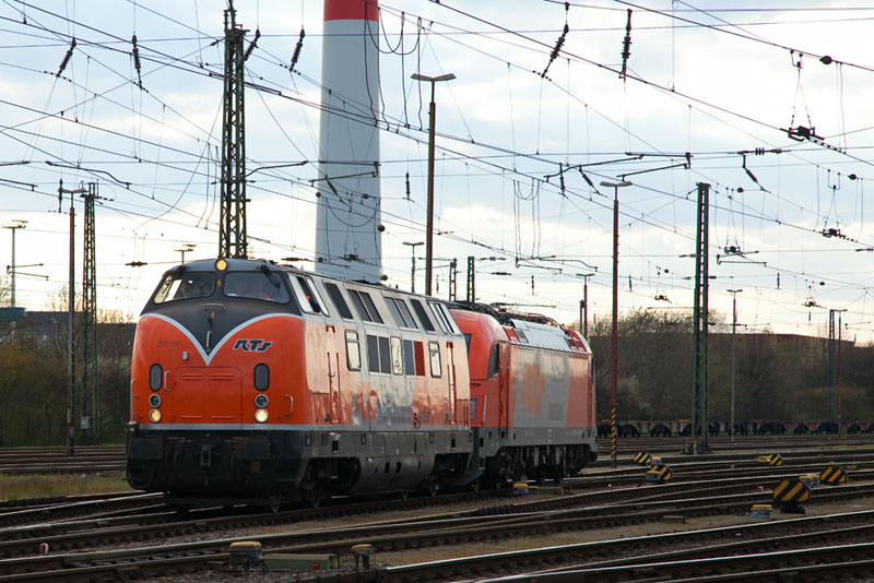 | Die 221.134 und 1216.903 der RTS vor einem Bauzug. Hamburg-Waltershof, 8. April 2012 |