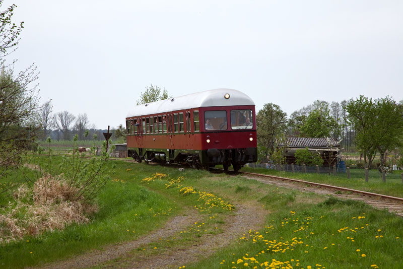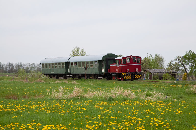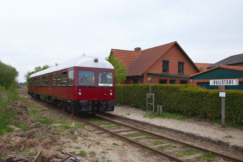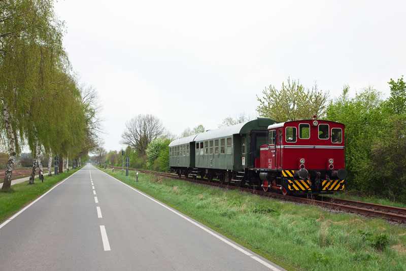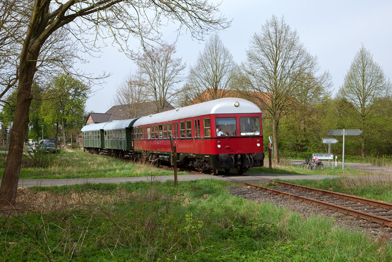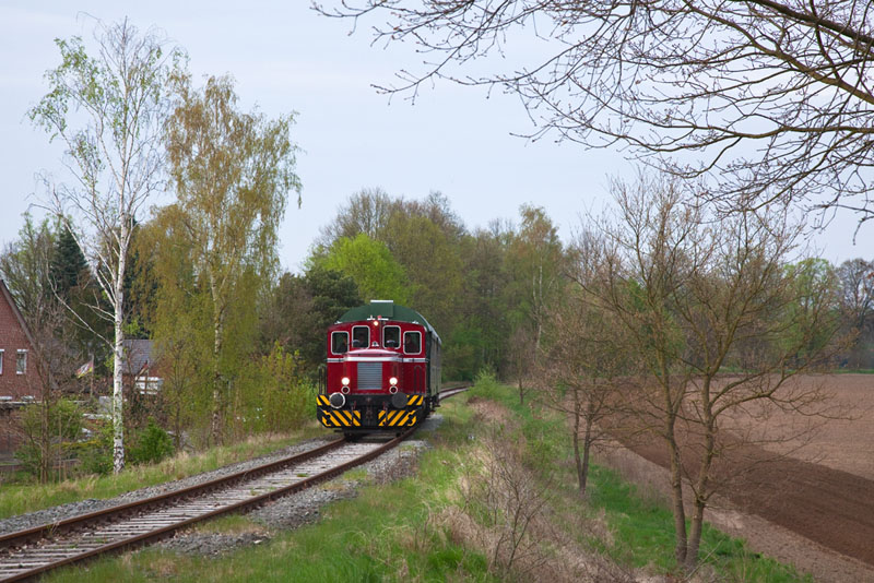 | Im gemütlichen Tempo brummte der MaK-Triebwagen weiter in Richtung Bleckede. Rullstorf, 29. April 2012 |