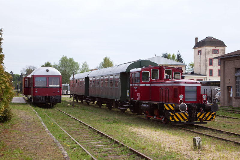 | Der MaK GDT 0518 und die 23041 vor dem Eisenbahn-Ausbesserungswerk. Bleckede, 29. April 2012 |