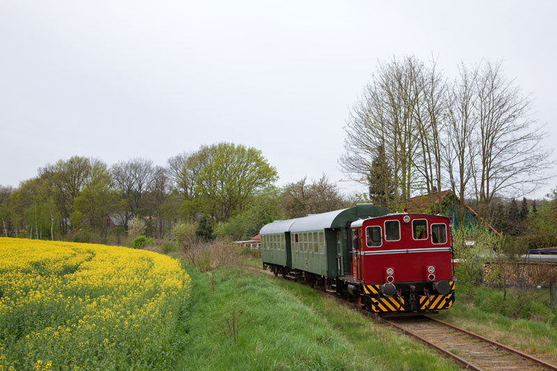 | Gemächlich kurbelte die 23041 mit ihrem Zügle an einem Rapsfeld vorüber. Scharnebeck, 29. April 2012 |