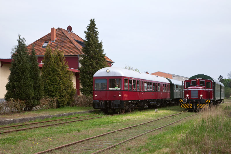 | Die beiden Züge vor dem ehemaligen Empfangsgebäude von Bleckede. Bleckede, 29. April 2012 |