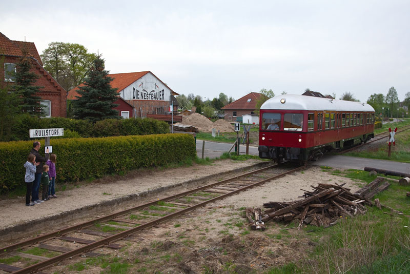 | Bei der Einfahrt in den Haltepunkt des Ortes vor der Tischlerei "Die Nestbauer". Rullstorf, 29. April 2012 |