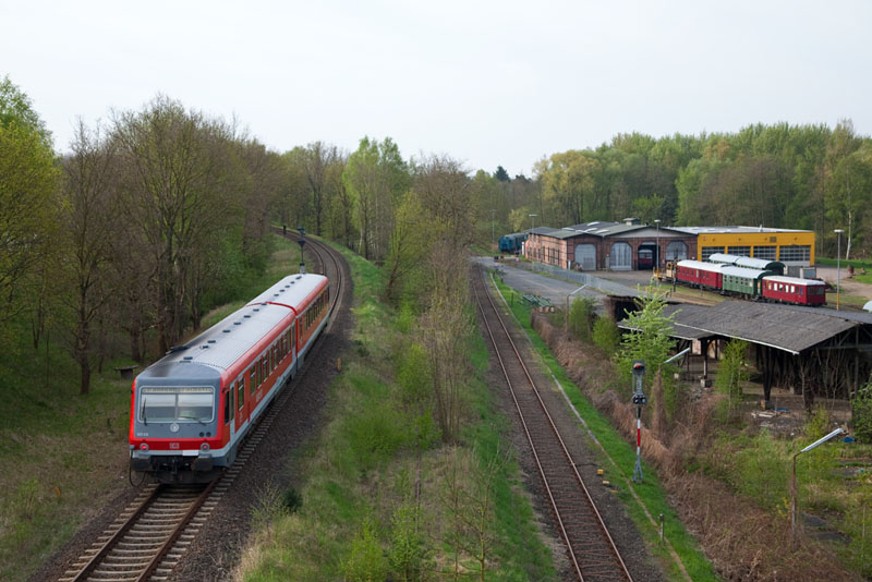 | Der 628/928 610 mit der RB 14533 als erste Leistung des Tages nach Dannenberg-Ost erklimmt die Rampe. Lüneburg Süd, 29. April 2012 |