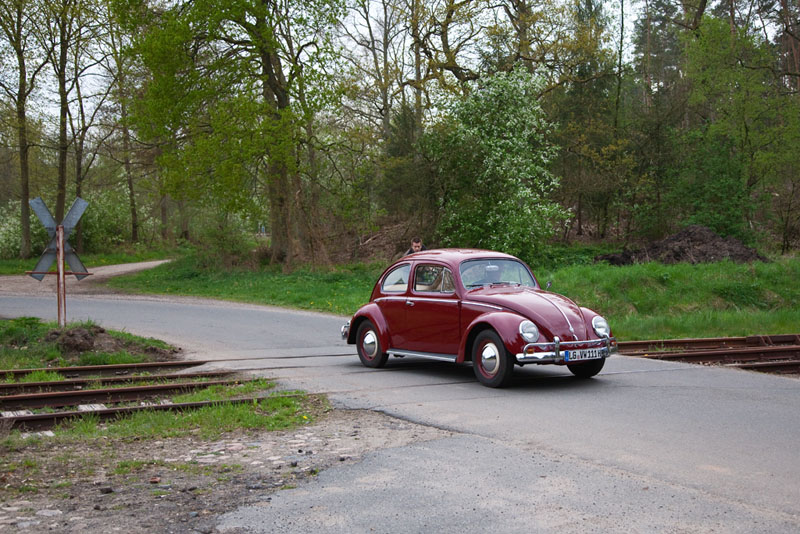 | Ein historischer VW Käfer überquerte nach dem Zug die Gleise. Boltersen, 29. April 2012 |