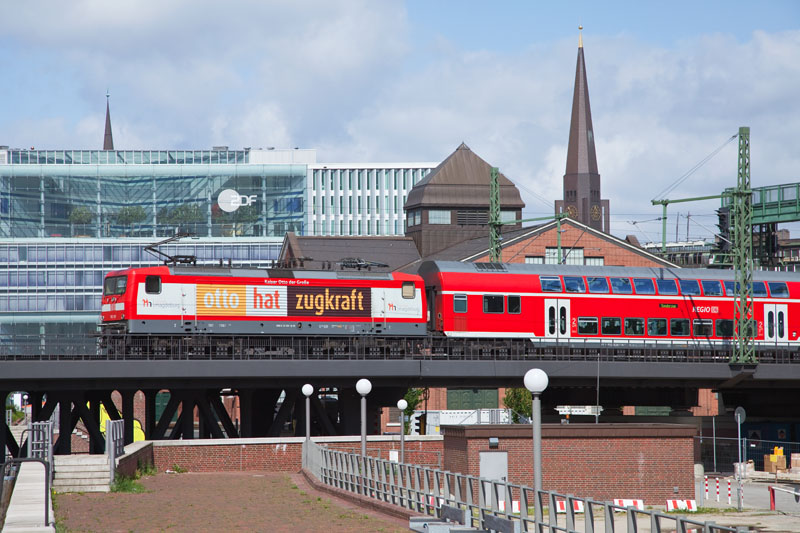 | Der Hafengeburtstagssonderzug RE 17660 Magdeburg - Hamburg mit den "OTTO"-Wagen. Hamburg Oberhafen, 12. Mai 2012 |