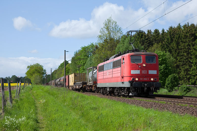 | Einen weiteren gemischten Güterzug nach Maschen hatte die 151 058-5 am Haken. Reindorf, 12. Mai 2012 |