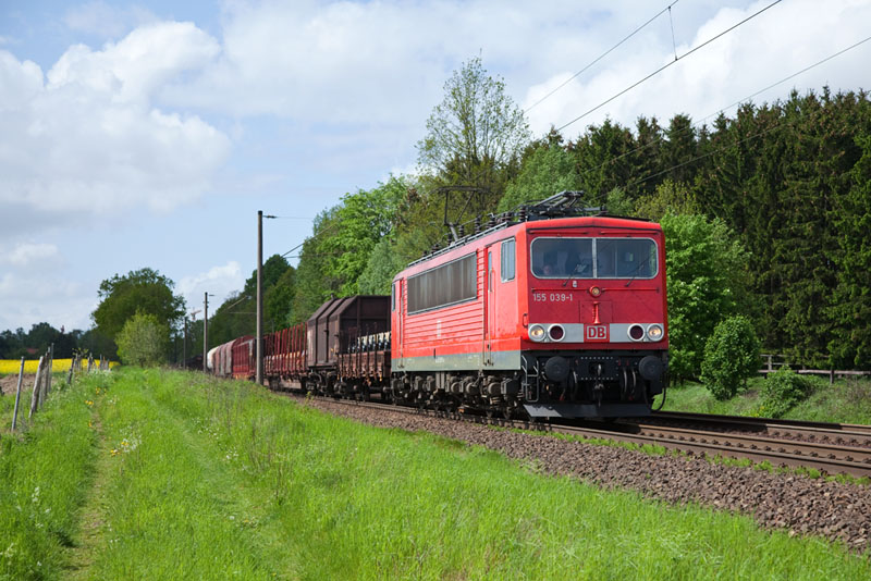 | Die sehr saubere 155 039-1 von DB Schenker Rail mit einem gemischten Güterzug. Reindorf, 12. Mai 2012 |