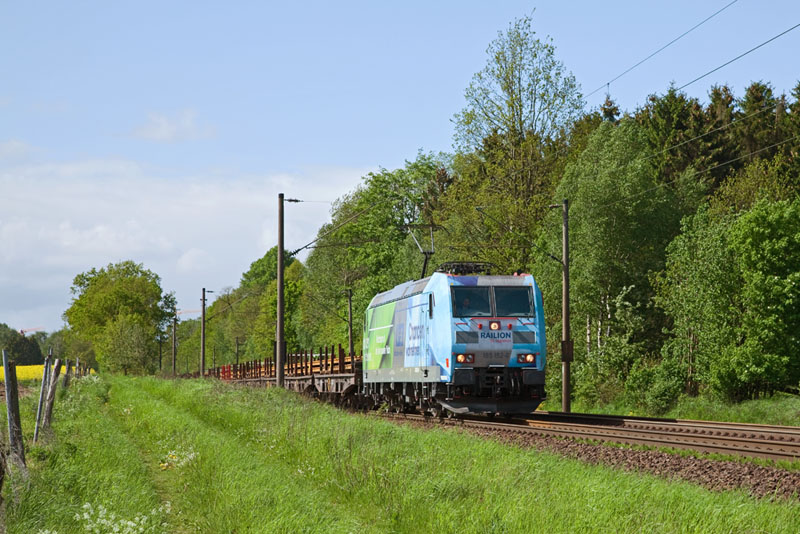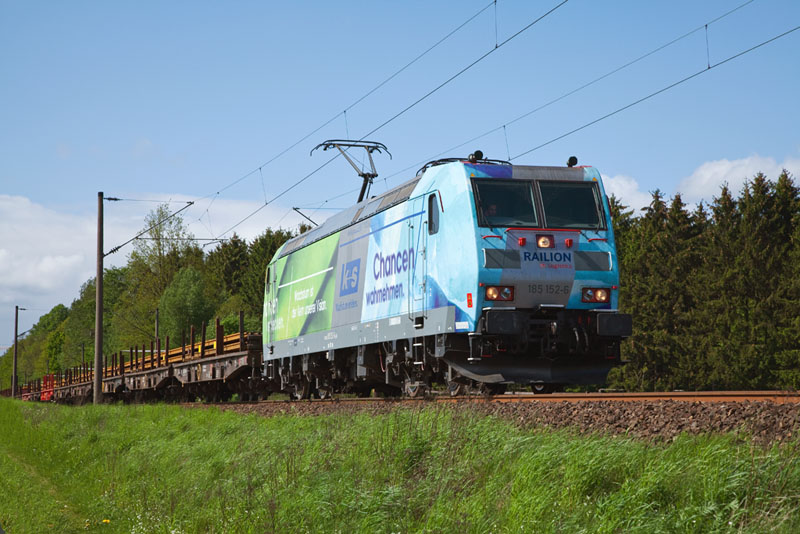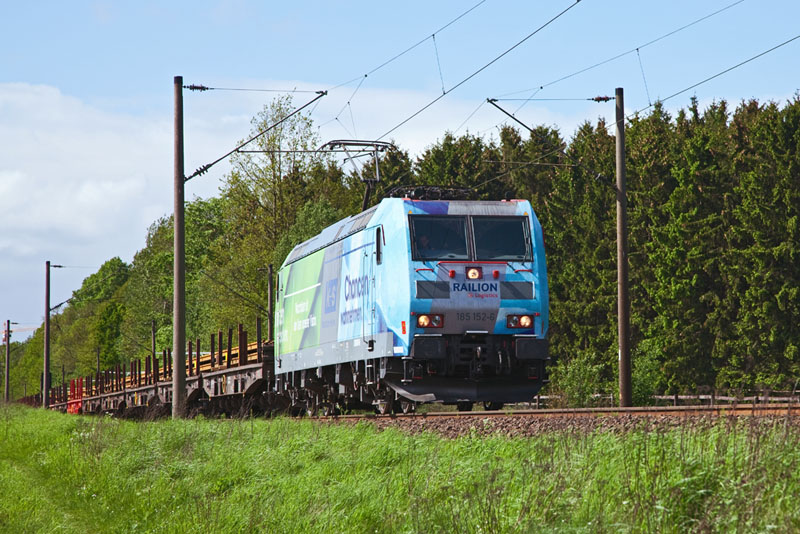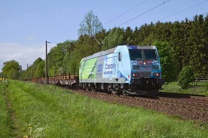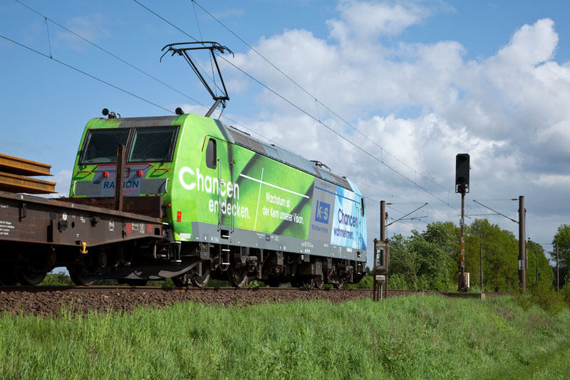| Die 185 152-6 macht Werbung für den Kooperationspartner der Bahn, nämlich Kali + Salz. Reindorf, 12. Mai 2012 |