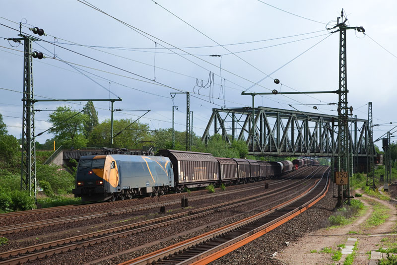 | Wahrlich ein langer Tatzelwurm, was die starke EG 3101 nach Schweden zu bringen hatte. Hamburg-Veddel, 12. Mai 2012 |