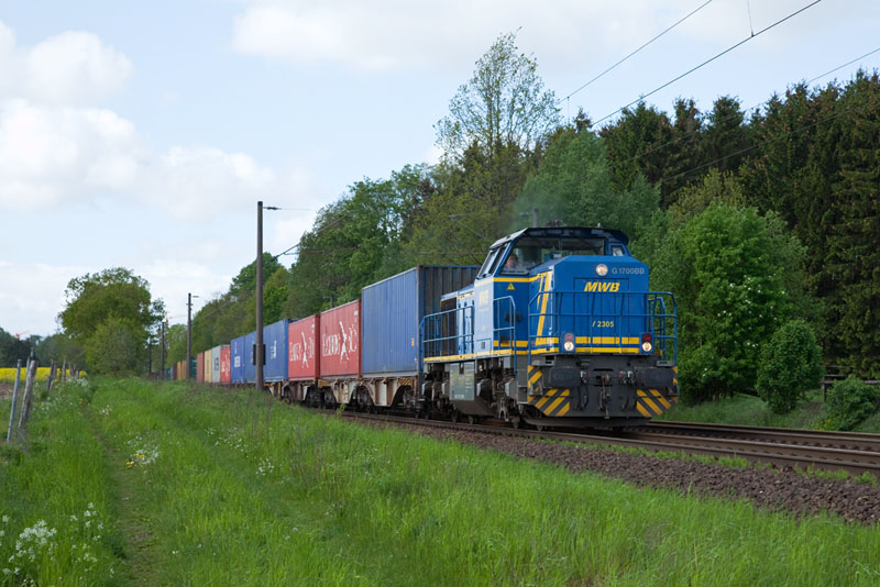 | Ein Containerzug mit der starken G 1700BB der Mittelweserbahn auf dem Weg nach Hamburg. Reindorf, 12. Mai 2012 |