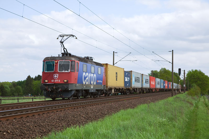 | Etliche Container brachte die 421 377-3 der SBB Cargo aus Hamburg. Reindorf, 12. Mai 2012 |