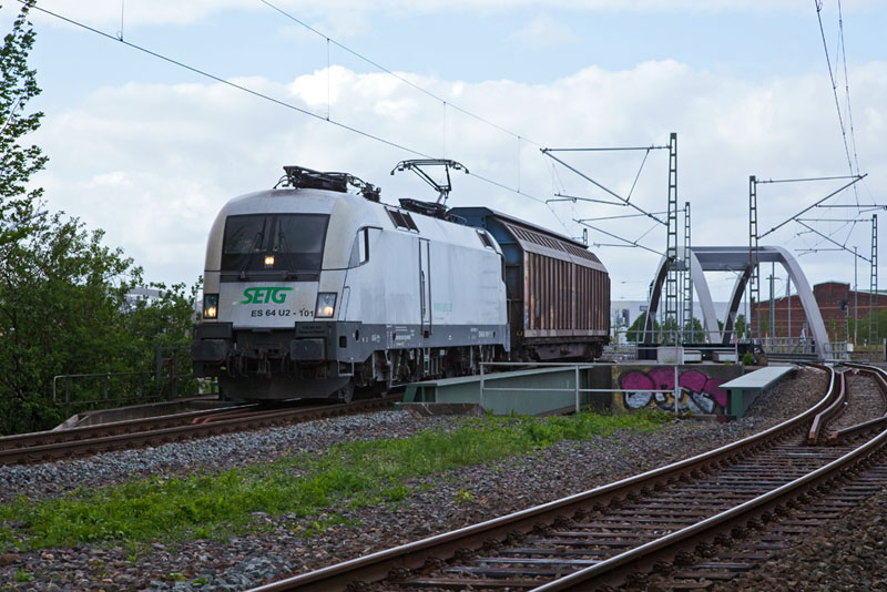 | Vom Hafenrangierbahnhof Hamburg Süd kam unerwartet die ES 64 U2-101 der SETG heraus! Hamburg-Veddel, 12. Mai 2012 |