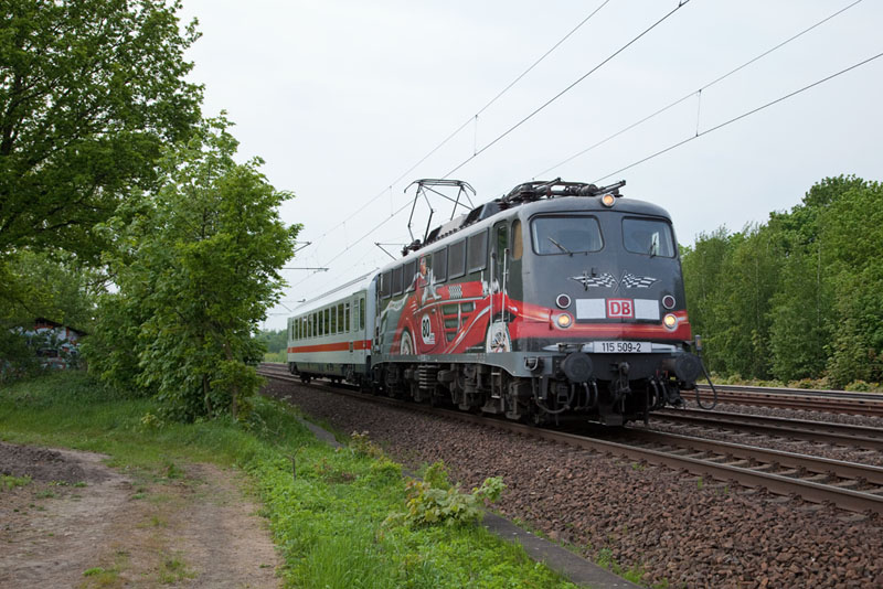 | Ach nein, die 115 509-2 "80 Jahre Autozug" kam mit einem kurzen Pbz von Neumünster nach HH-Langenfelde. Halstenbek, 14. Mai 2012 |
