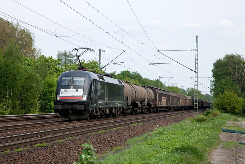 | Die immer noch schwarze 242.517 "Fitzgerald" von HECTORRAIL mit einem Scand Fibre Logistics-Zug. Halstenbek, 14. Mai 2012 |