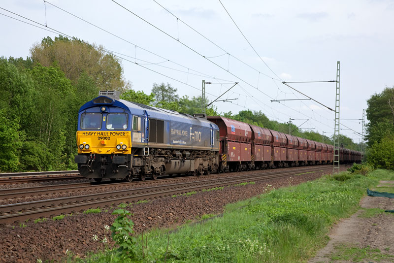 | Dann kam die außergwöhnliche Fuhre mit der HHPI 29002 und dem Kohlenzug DGS 95120 von Hohe Schaar nach Brunsbüttel. Halstenbek, 14. Mai 2012 | ||