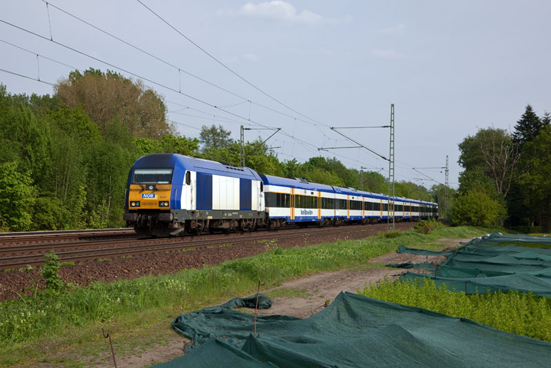 | Die Nord-Ostsee-Bahn nach Westerland (Sylt) mit der DE 2000-01. Halstenbek, 14. Mai 2012 |