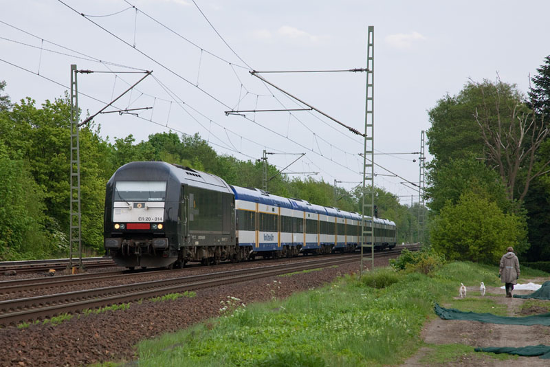 | Die nächste Nord-Ostsee-Bahn nach Westerland (Sylt) mit der schwarzen ER 20-014. Halstenbek, 14. Mai 2012 |