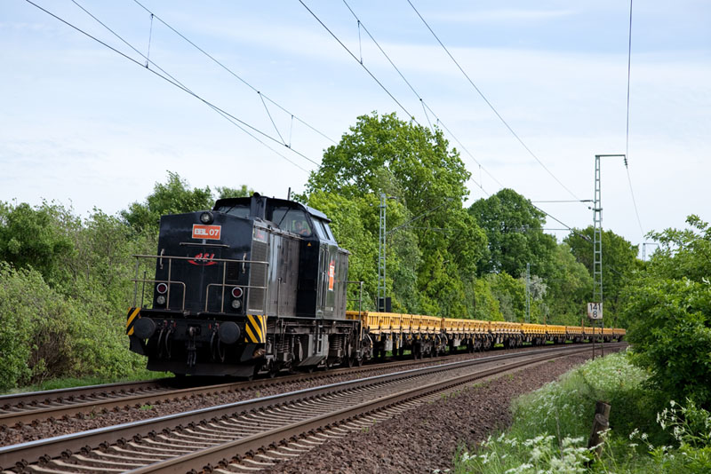 | Die schwarze BBL07 alias 203 148-2 mit einem Bauzug. Osterholz-Scharmbeck, 18. Mai 2012 |