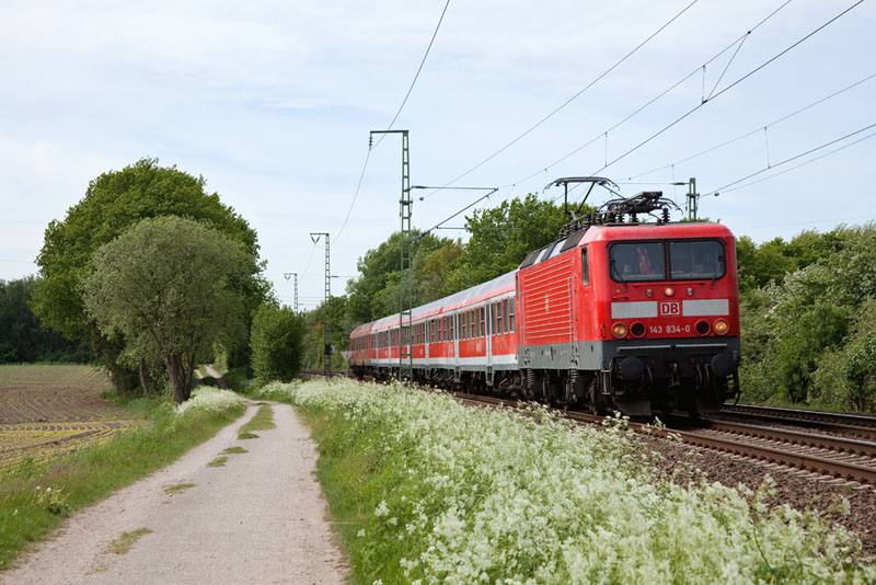 | Nanu, eine RegionalBahn der DB trotz der Regio-S-Bahn?!? Die 143 834-0 mit "n-Wagen". Osterholz-Scharmbeck, 18. Mai 2012 |