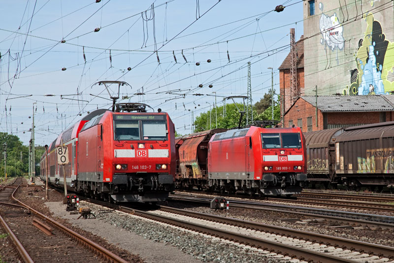 | Begegnung der TRAXX-Lokomotiven von Bombardier – die 146 103-7 kam mit einem RE nach Hannover. Verden (Aller), 18. Mai 2012 |
