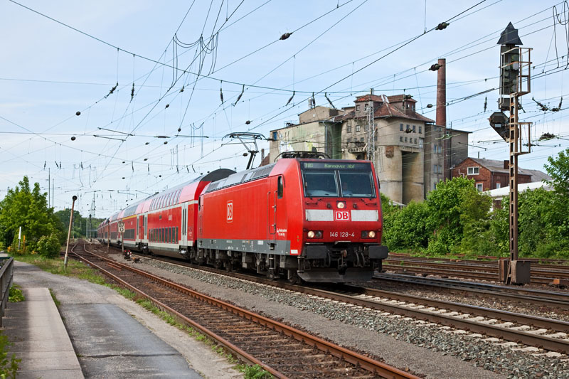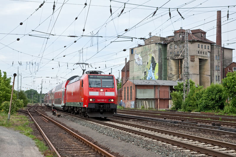| Die 146 105-2 mit dem nächsten schnellen RE nach Hannover. Verden (Aller), 18. Mai 2012 |