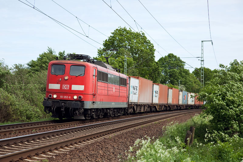 | Dagegen hatte die 151 053-6 einen Containerzug von Bremerhaven. Osterholz-Scharmbeck, 18. Mai 2012 |