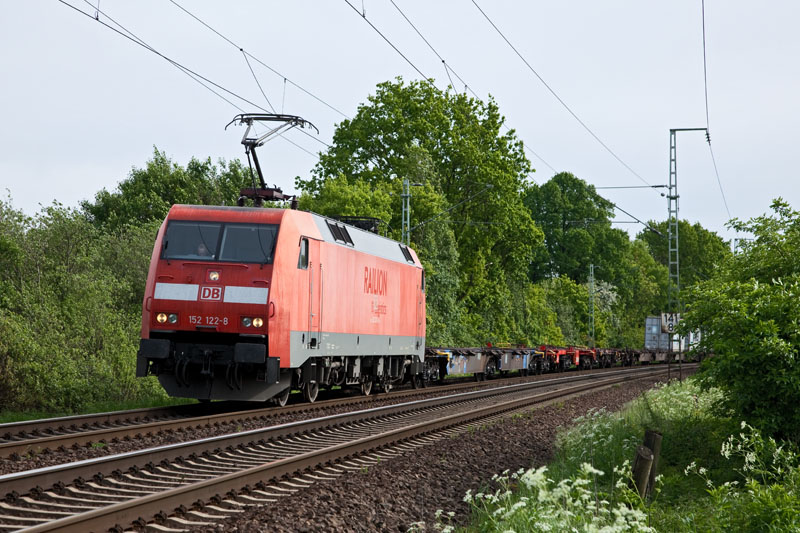 | Einen recht leeren Containerzug von Bremerhaven hatte die 152 122-8 am Haken. Osterholz-Scharmbeck, 18. Mai 2012 |