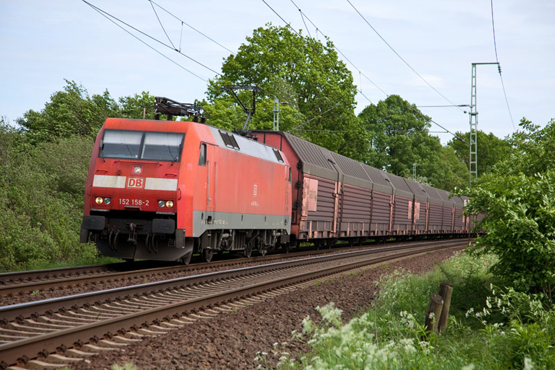 | Einen leeren Autologistikzug der DB hatte die 152 158-2 von Bremerhaven am Haken. Osterholz-Scharmbeck, 18. Mai 2012 |
