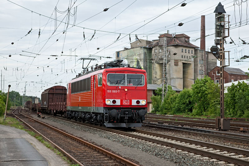 | Die sehr gut aussehende 155 060-7 vor einem gemischten Güterzug. Verden (Aller), 18. Mai 2012 |