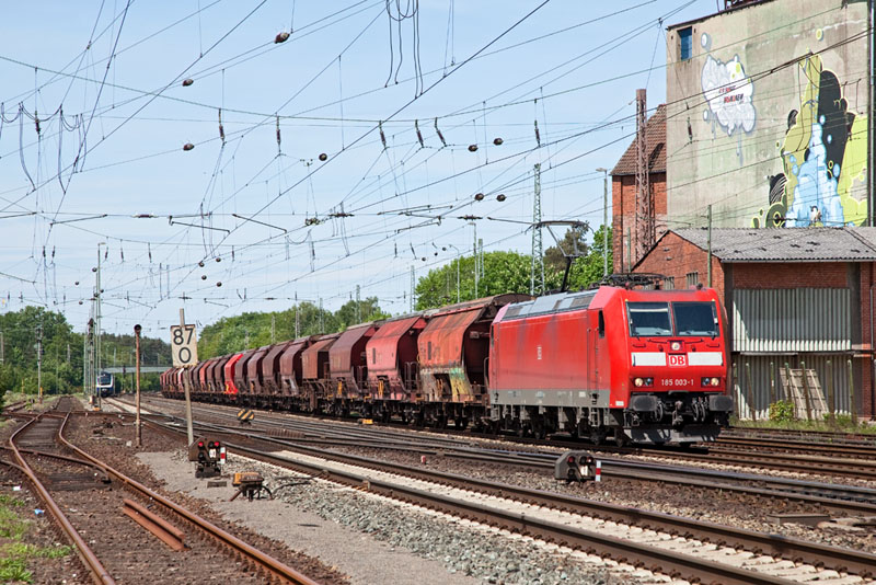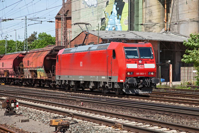 | Die 185 003-1 hat wie ihre beiden Schwesterloks 185 001 + 002 ein umgebautes oberes Spitzenlicht. Verden (Aller), 18. Mai 2012 |
