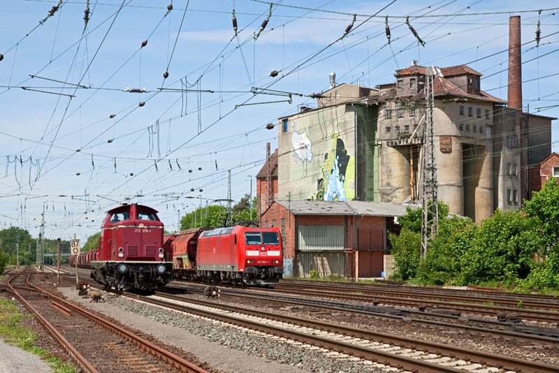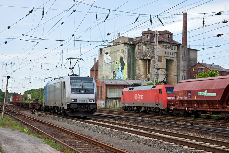 | Auch die ehemalige ungarische EuroCom-Lok 185 716-8 kam von Bremerhaven und kreuzte mit der 152 048-5 vor einem Cerealienzug nach Hamburg-Hohe Schaar. Verden (Aller), 18. Mai 2012 | ||