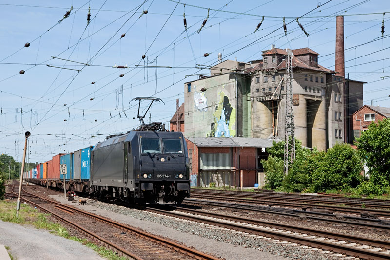 | Wohl von Bremerhaven kam die 185 574-1 mit ihrem Containerzug. Verden (Aller), 18. Mai 2012 |