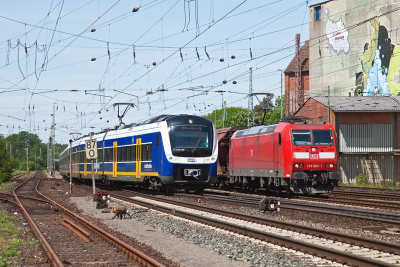 | Während die 185 003-1 warten musste, kam die RS 1 mit den ET 440 340 und 440 716. Verden (Aller), 18. Mai 2012 |