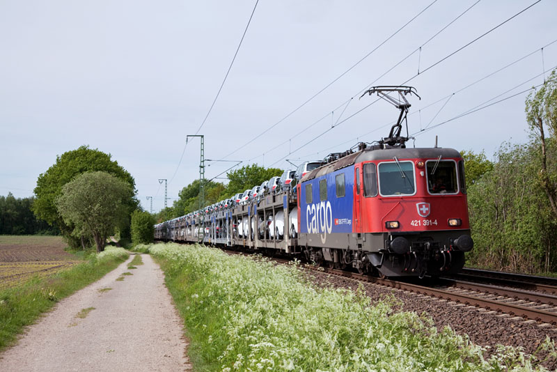 | Ebenso die 421 391-4 der SBB Cargo / EVB für die BLG nach Bremerhaven. Osterholz-Scharmbeck, 18. Mai 2012 |
