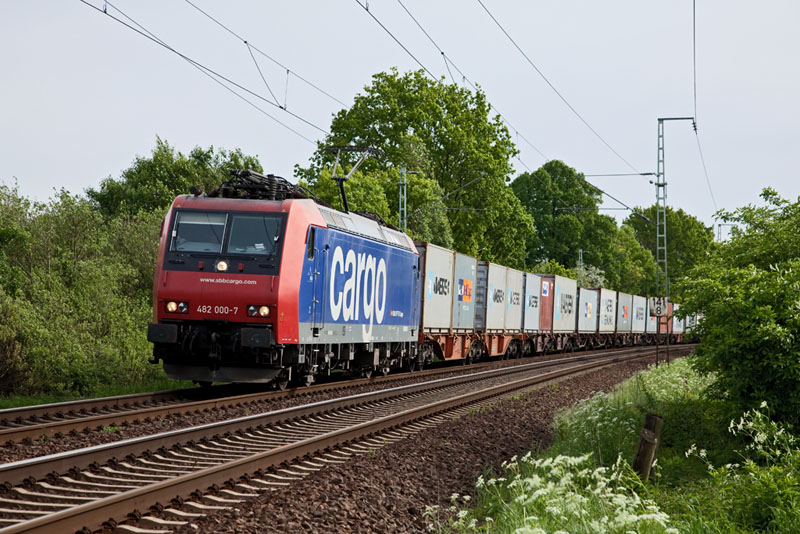 | Von Bremerhaven kam der Containerzug mit der SBB Cargo 482 000-7. Osterholz-Scharmbeck, 18. Mai 2012 |
