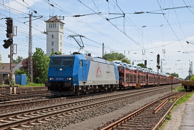 | Noch mehr Autos brachte die 185 513-9 der TX Logistik nach Bremerhaven. Verden (Aller), 18. Mai 2012 |