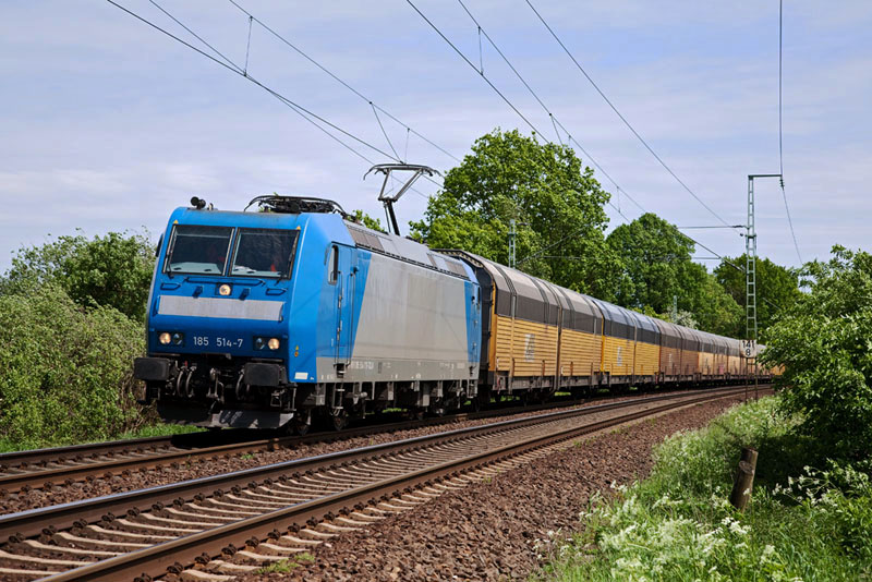| Einen PCT Altmann-Autologistikzug von Bremerhaven hatte die 185 514-7 der TX Logistik. Osterholz-Scharmbeck, 18. Mai 2012 |
