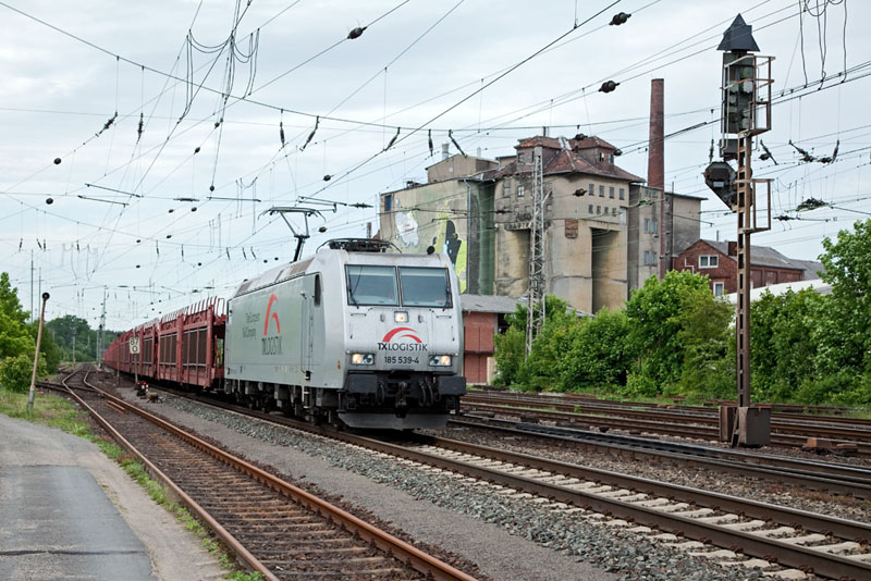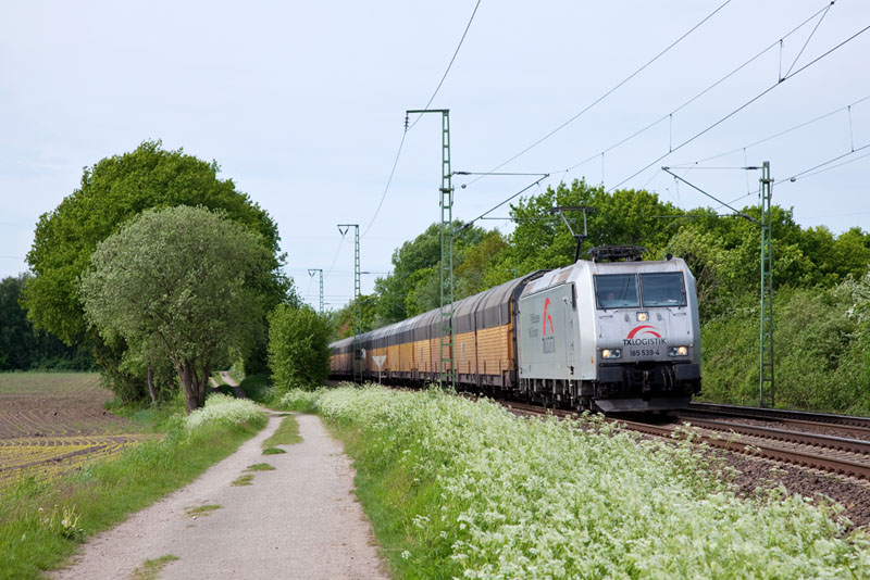 | Die 185 539-4 der TX Logistik vor einem leeren Autologistikzug. Verden (Aller), 18. Mai 2012 |