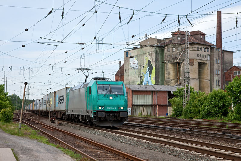 | Noch mehr Seekisten von Bremerhaven mit der 185 614-5 der TX Logistik. Verden (Aller), 18. Mai 2012 |
