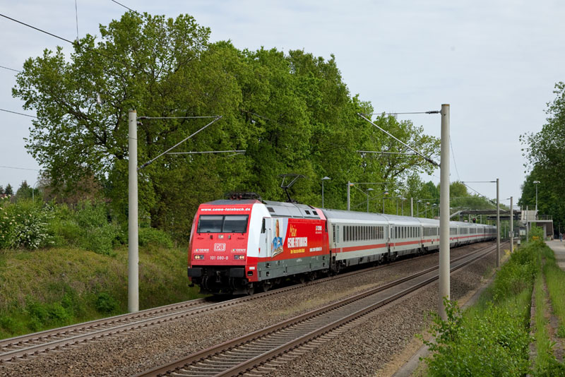 | Die frisch beklebte erste von vier CEWE-Werbeloks, die 101 080-0 mit dem InterCity 2025. Klecken, 19. Mai 2012 |