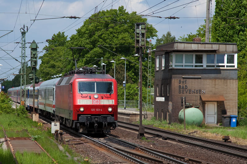 | Einen Sonderzug hatte die 120 133-4 in den Süden zu befördern. Bad Bevensen, 19. Mai 2012 |