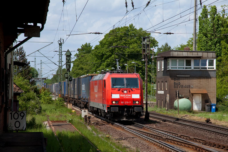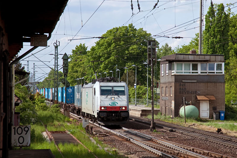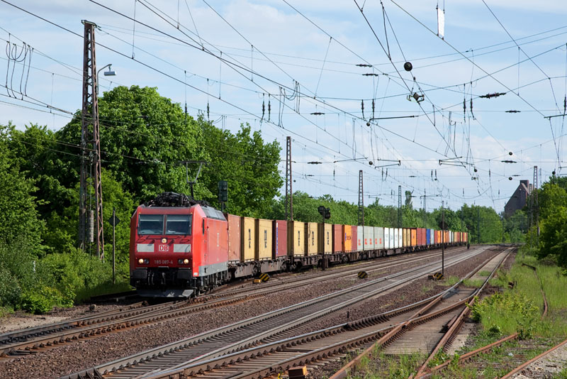 | Nachdem die 185 087-4 mit ihrem Containerzug einen ICE durchgelassen hat, fuhr sie weiter nach Hamburg. Bad Bevensen, 19. Mai 2012 |