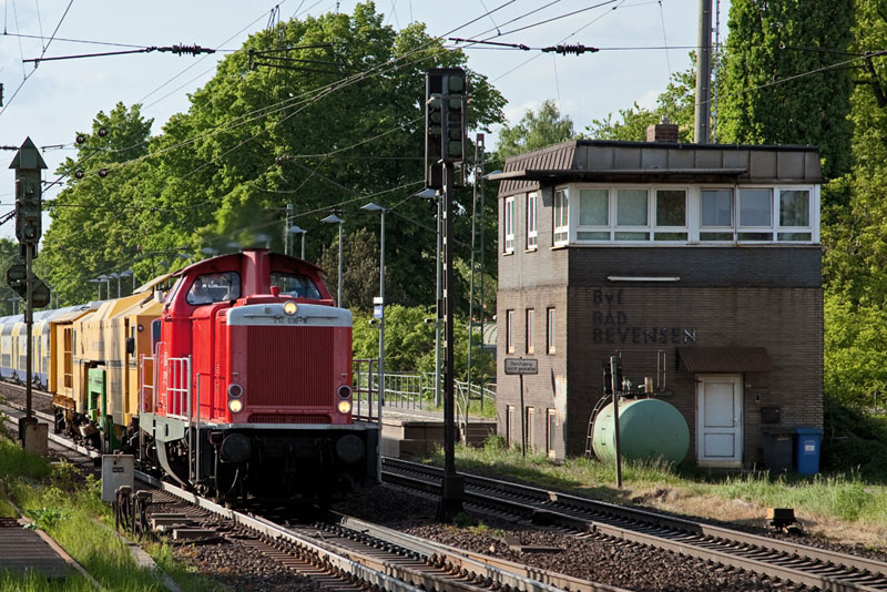 | Die 212 036-8 von DB Netz beförderte einen Bauzug südwärts. Bad Bevensen, 19. Mai 2012 |