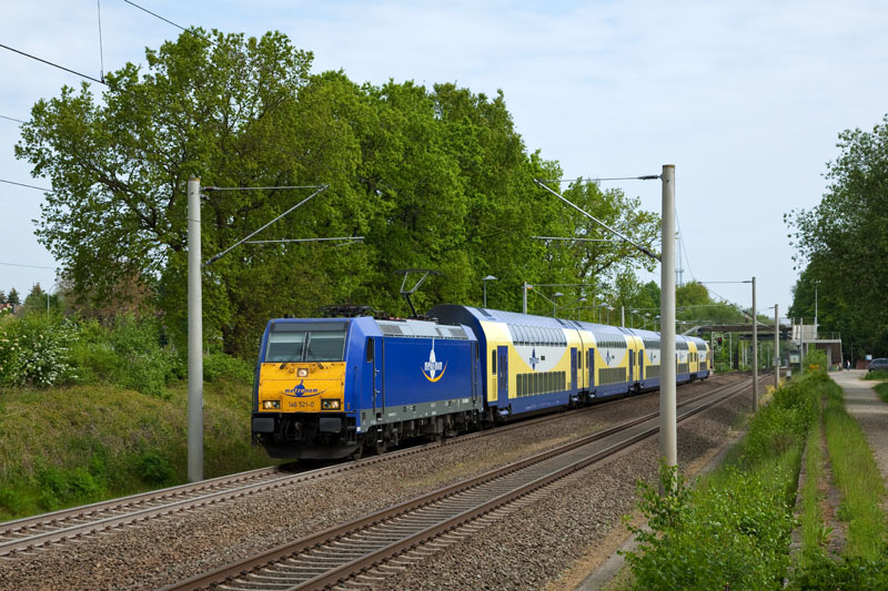 | Eine von mittlerweile zwei Leihloks bei metronom, die 146 521-0 beschleunigt mit ihrem MEr. Klecken, 19. Mai 2012 |