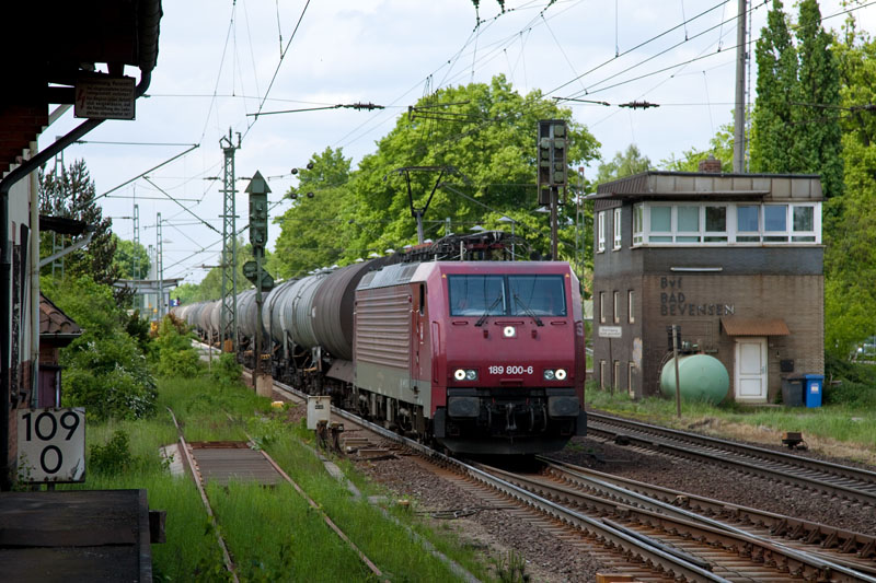 | Nicht schon wieder, wie immer mit Wolkenschaden bei der MTEG 189 800-6 vor einem Kesselwagenzug. Bad Bevensen, 19. Mai 2012 |