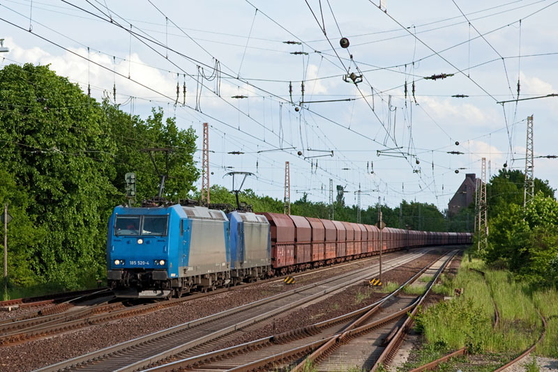 | Der allabendliche VPS-Erzleerpark von Beddingen nach Hamburg Hansaport mit 185 520-4 und 185 509-7. Bad Bevensen, 19. Mai 2012 |