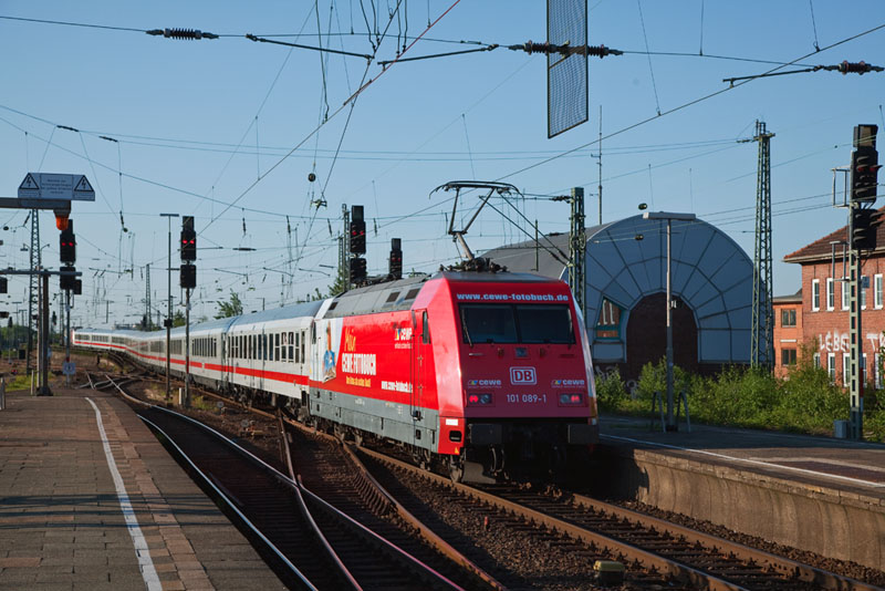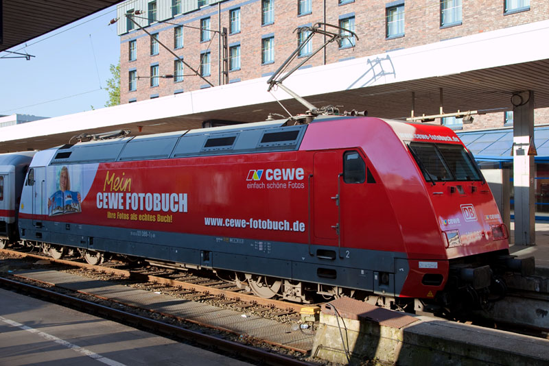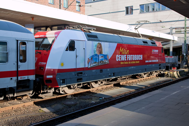 | Die 101 089-1 ganz frisch beklebt als dritte "CEWE"-Werbelok am IC 2188. Hamburg-Altona, 24. Mai 2012 |