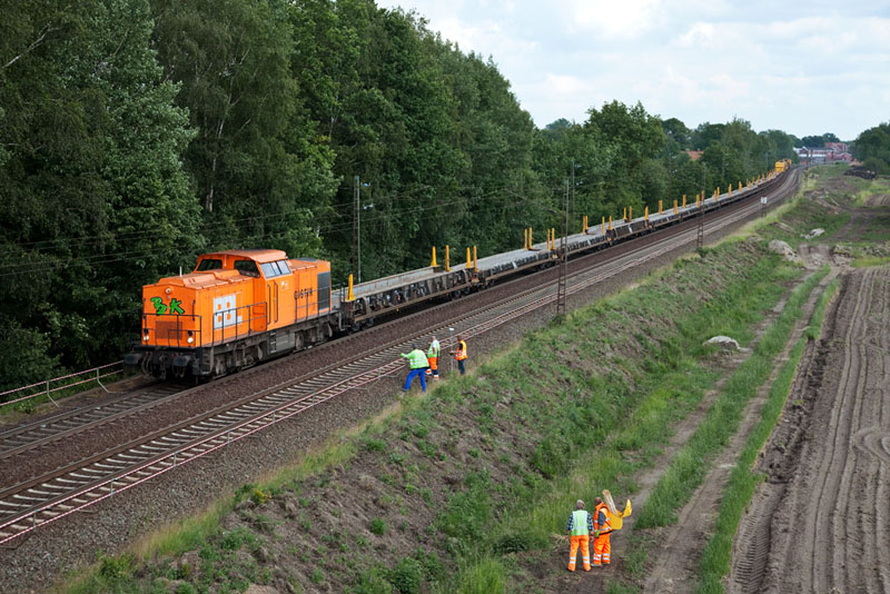 | Während ein Messteam an den Gleisen zugange war, kam die 203 157-3 aka Lok 11 mit einem Bauzug. Grevelau, 7. Juni 2012 |
